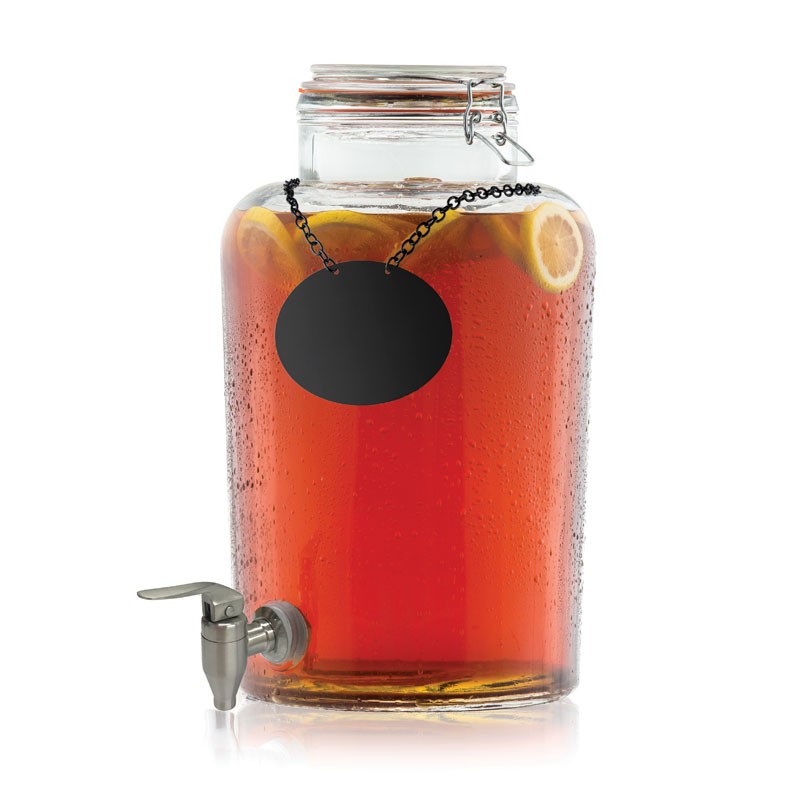 Dispensador de bebidas con grifo de acero inoxidable. Incluye collar de pizarra
